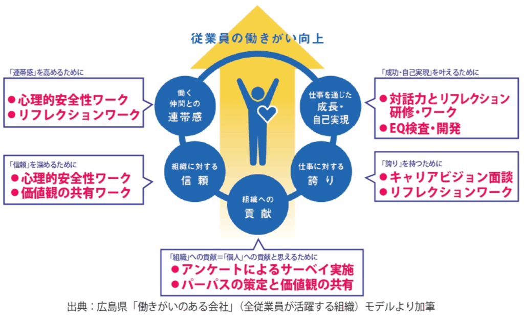 「働きがいを持とう」「働きがいのある組織づくりを」と言われているものの実際のところ、「働きがいのある組織」って?何がどうなれば?と思われている企業の方の声をよく聞きます。広島県では「働きがい」に着目したこれからの働き方改革とは?の中で、働きがいの高さとして「働きがいを高める従業員の心理的要素」を紹介しています。